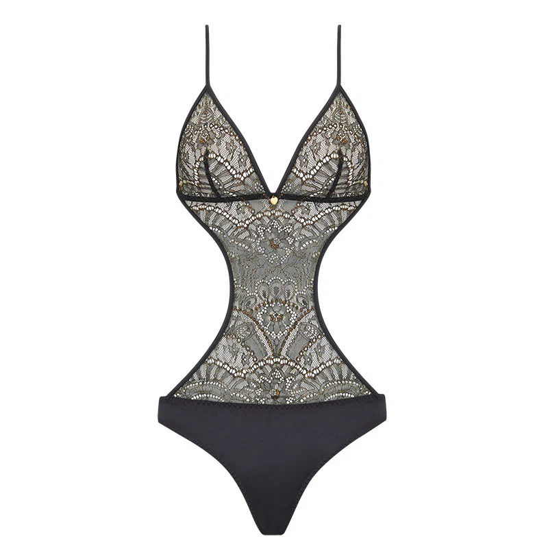 Playfully seductive, discover the Gilded Heart Bodysuit.The Gilded Heart Bodysuit combines a modern silhouette with a glamorous gold flecked lace. Triangle shaped cups are made up from Gilded Heart's black lace and the jet black satin bottom covers your form while the back has a heart shaped black and gold lace gives a glimpse of your bum. The half moon crescent cut outs in the body accentuates the body's natural curves.