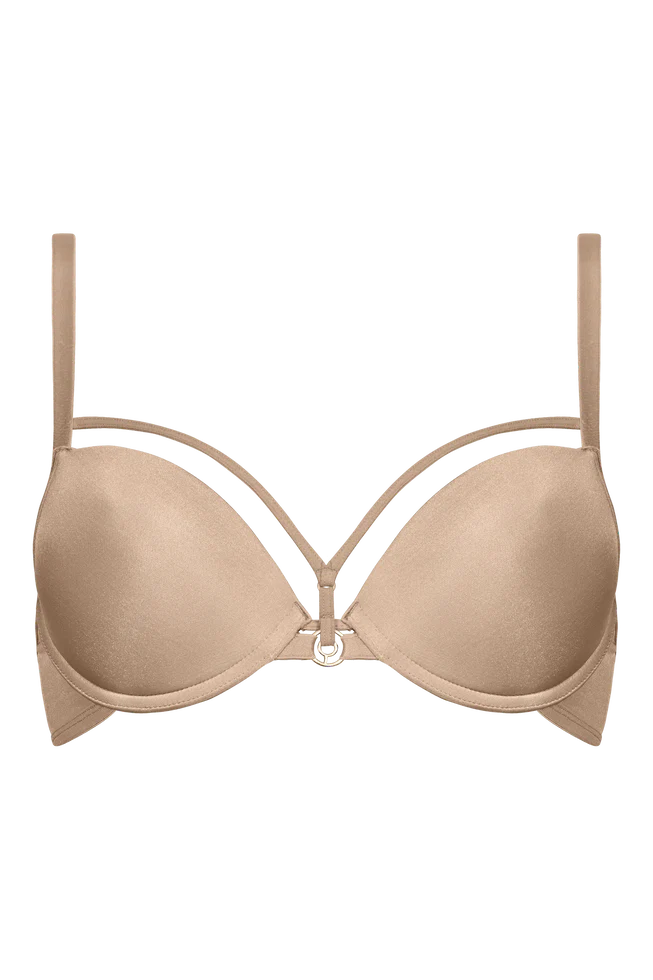 Made of the highest quality materials, the Space Odyssey Padded Plunge Bra from Marlies Dekkers features a provocative single strap detail above the bust that plunges between the breasts and is attached to a glimmering gold accent piece. Gentle padding contours and shapes the bust, while the underwire provides just the right amount of support and lift. Designed with a seductive plunging neckline, this piece is made from a luxuriously soft, stretch material in a beautiful camel colour. This elegant piece features fully adjustable shoulder straps and a standard rear hook and eye closure.