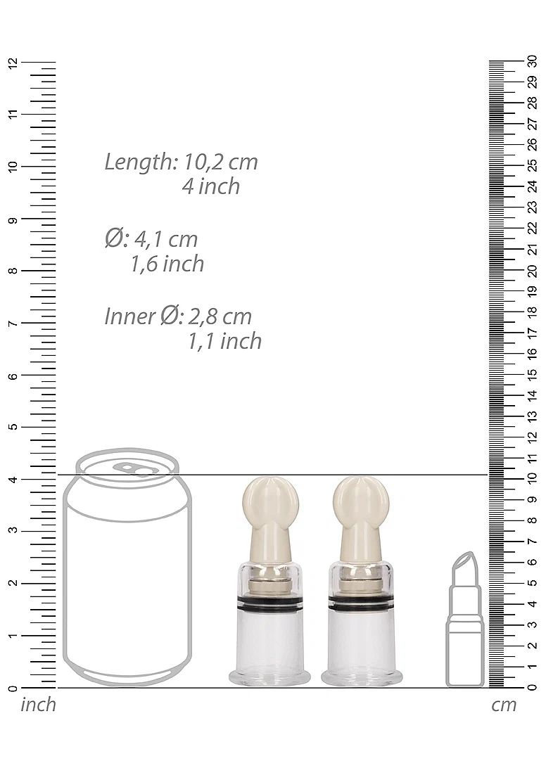 Nipple Suction Set. Feel the stimulation of suction with these kinky nipple cups! These suckers can be easily applied and twisted for extra hard, sensationally sensitive nipples. Perfect for use during solo play or with a partner, heighten your senses and enjoy deliciously new levels of arousal. Comes in a set of two. Size Medium.