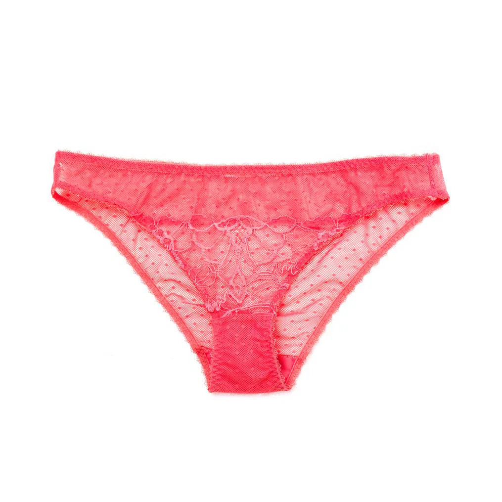 Stella McCartney Giselle Charming Bikini. Fun, azalea pink panties by designer Stella McCartney. Subtle point d'esprit mesh blends perfectly with delicate, floral lace. The smooth elastic waist and leg bands are gentle on the skin, making these panties comfortable to wear all day.